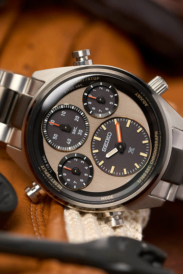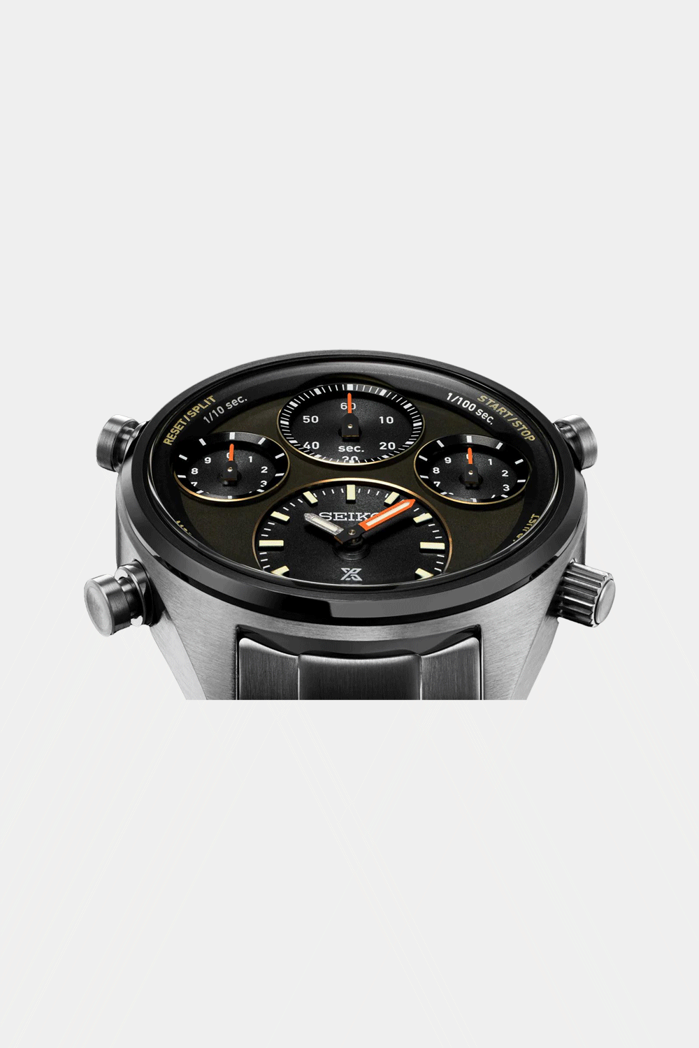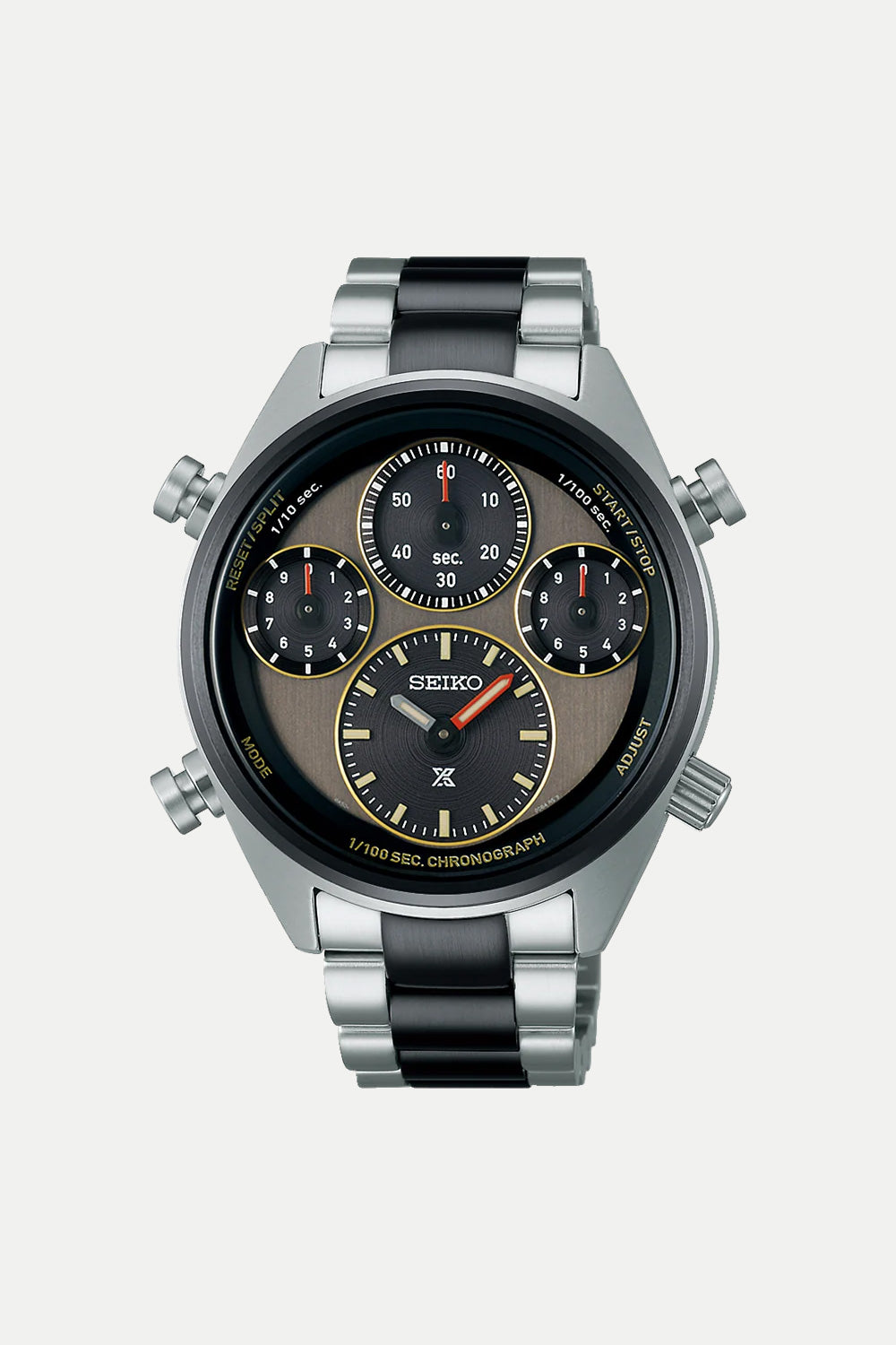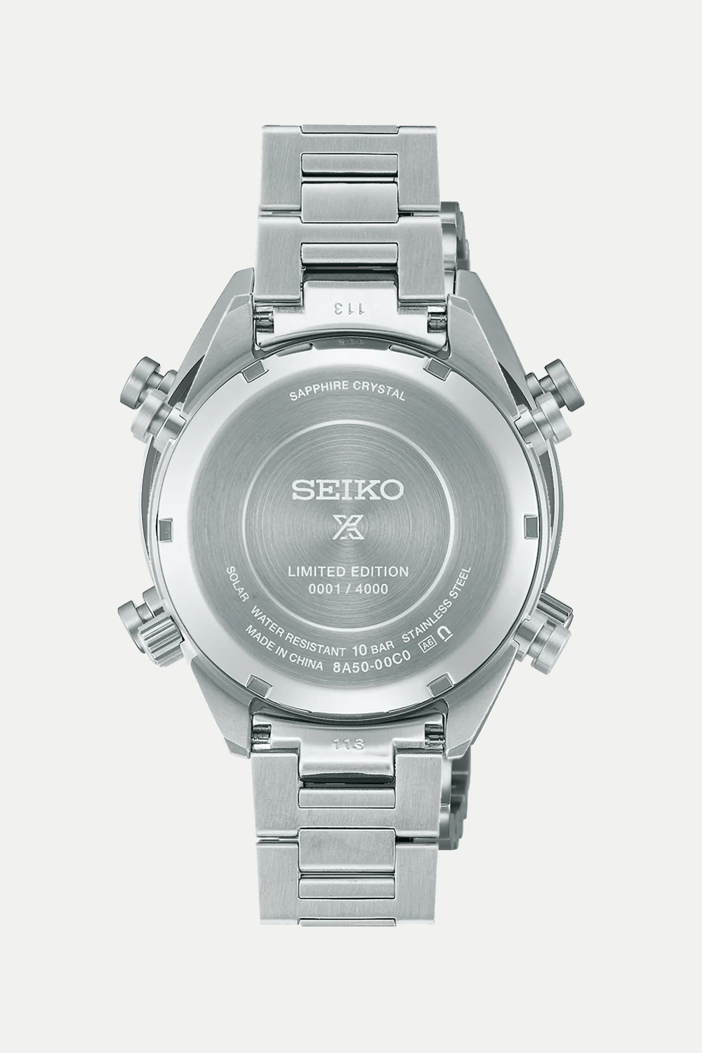 Prospex Speedtimer 40th Anniversary Limited Edition. Designed for those who treat life as the ultimate adventure, Seiko Prospex keeps moving forward, meeting every challenge with technological excellence and winning design. This extraordinary Limited Edition, available only in a controlled-production run of 4,000, with the serial number engraved on each caseback, celebrates the 40th anniversary of the first analog quartz chronograph equipped with a 1/100-second stopwatch. Featuring the new solar chronograph 8A50 movement, this exceptional watch includes a highly legible, uniquely designed dial with a warm charcoal gray base and four inset black subdials, separating the time dial from the chronograph indicators, and LumiBrite hands and markers. The chronograph function measures up to 60 minutes of elapsed time in 1/100-second increments and provides a split time function, while the solar cell, powered by any light source, with no battery change required, offers a 6-month power reserve when fully charged. To allow easy utilization of the stopwatch feature, this precision watch features concave tops on the hammer-shaped pushers. With a curved anti-reflective sapphire crystal, this rugged stainless steel timepiece includes stylish black center links, a screwdown caseback and tri-fold push button release clasp. 10 bar, 100M Water Resistant.
