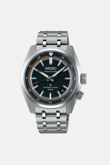 The Seiko Prospex Speedtimer SPB515J1 brings sporty precision and heritage style into a versatile mechanical watch designed for everyday wear and performance timing. Its compact stainless steel case measures 39.5 mm in diameter and offers a comfortable fit that suits most wrist sizes while maintaining a strong presence on the wrist. The matte black dial features luminous hands and markers for excellent readability in all lighting conditions. A subtle touch of orange on the seconds hand and internal ring adds dynamic contrast that reflects the model’s racing roots. The curved sapphire crystal with anti-reflective coating ensures clear visibility, and robust finish work enhances durability and comfort.