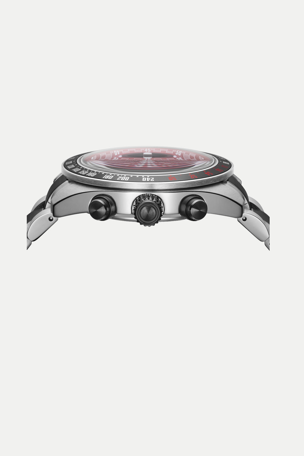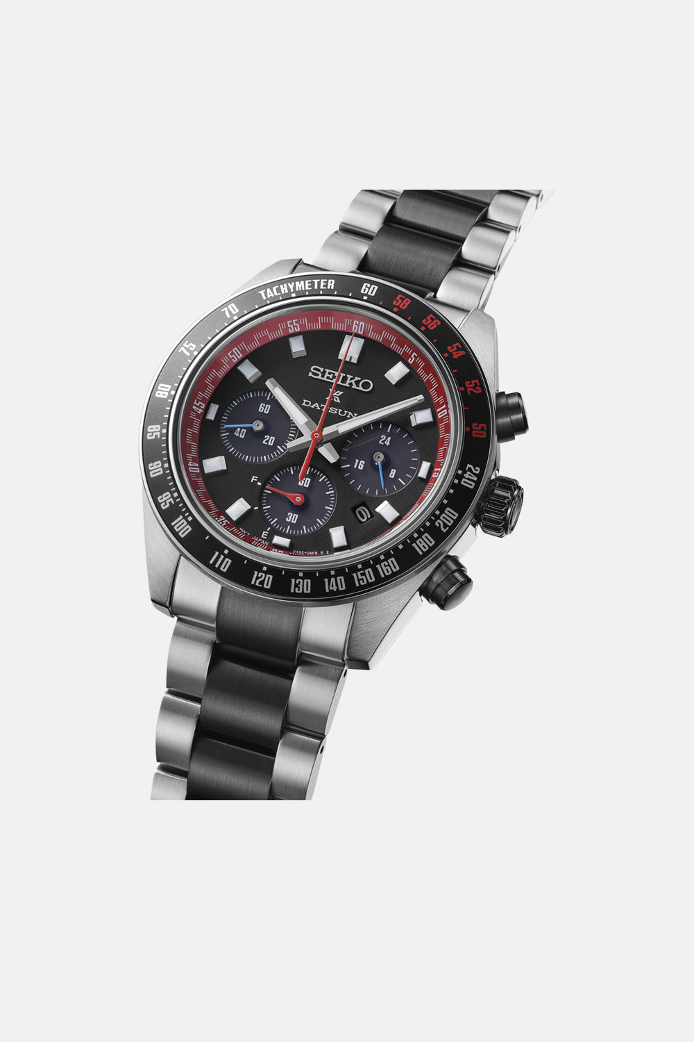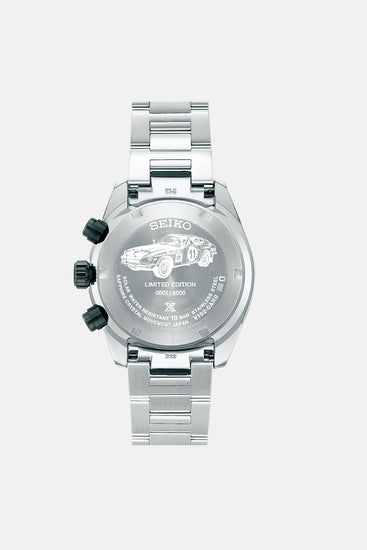 The Seiko Prospex SSC957 celebrates both motorsport heritage and modern timekeeping precision. A limited production of 4,000 pieces honors the legacy of the Datsun 240Z rally car with design touches like the tachymeter bezel and engraved Datsun logo on its case back. Its solar V192 movement powers the chronograph with a six-month reserve once fully charged and includes functions for small seconds 24-hour reading and a power reserve indicator.