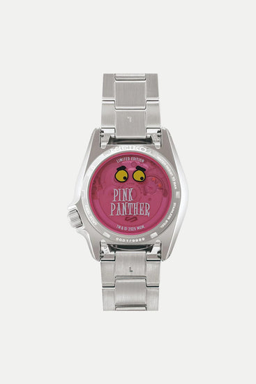 Inspired by the Seiko 5 Sports SKX series, this special edition draws directly from the animated short The Pink Phink. The story of the Pink Panther slyly repainting the Little Man’s house in pink is woven throughout the design, with the dial, bezel, and seconds hand highlighted in the character’s signature hue. Iconic footprints appear on the dial as well, guiding the Little Man—and the wearer—to the Pink Panther himself, completing the watch’s whimsical identity.