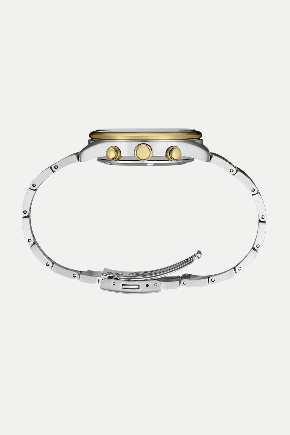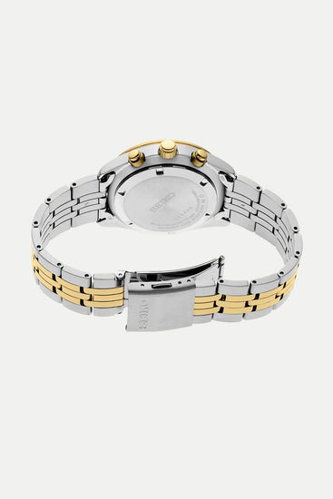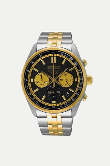 From the Essentials Collection. Inspired by motor sports, this dynamic chronograph features a black dial with bold, highly legible gold subdials at 3 and 9 o’clock styled to suggest a racecar instrument panel. Framed by a black tachymeter outer ring, the dial also offers a date calendar as well as a 24-hour subdial. The chronograph provides measurement of up to 60 minutes of elapsed time in 1/5-second increments. Crafted of stainless steel with mirror and hairline two-tone finish and tri-fold push button release clasp. 10 bar, 100M Water Resistant.