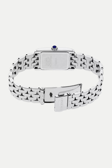 The Seiko SWR083 is a refined quartz timepiece crafted to elevate dress occasions with subtle elegance. It features a patterned white dial adorned with classic Roman numerals and blue hands. A blue cabochon crown adds a quiet touch of sophistication. Its rectangular stainless steel case, sized at just over twenty two millimeters wide, keeps the watch delicate yet noticeable. This model shines with a five-row bracelet that offers both class and comfort.
