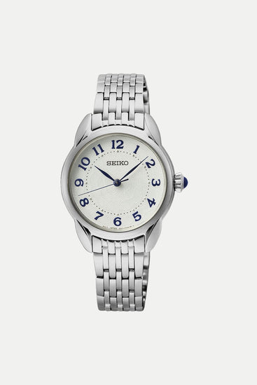 The Seiko SUR561 epitomizes timeless elegance with a modern flair. This finely crafted timepiece boasts a stainless steel bracelet and case, blending durability with sophistication suitable for any occasion, be it formal or casual. Its silver-patterned dial exudes delicacy, accentuated by vibrant blue numerals and hands for enhanced readability and a touch of color. The dial's textured background catches the light, imparting a subtle yet captivating allure. With a dependable quartz movement and water resistance up to 5 bar, this watch ensures both precision and durability. Completing its refined look is the blue cabochon crown, adding a final touch of sophistication to this versatile and stylish Seiko accessory.