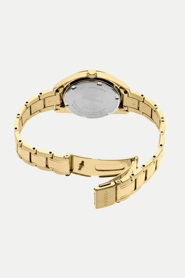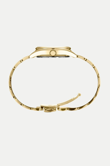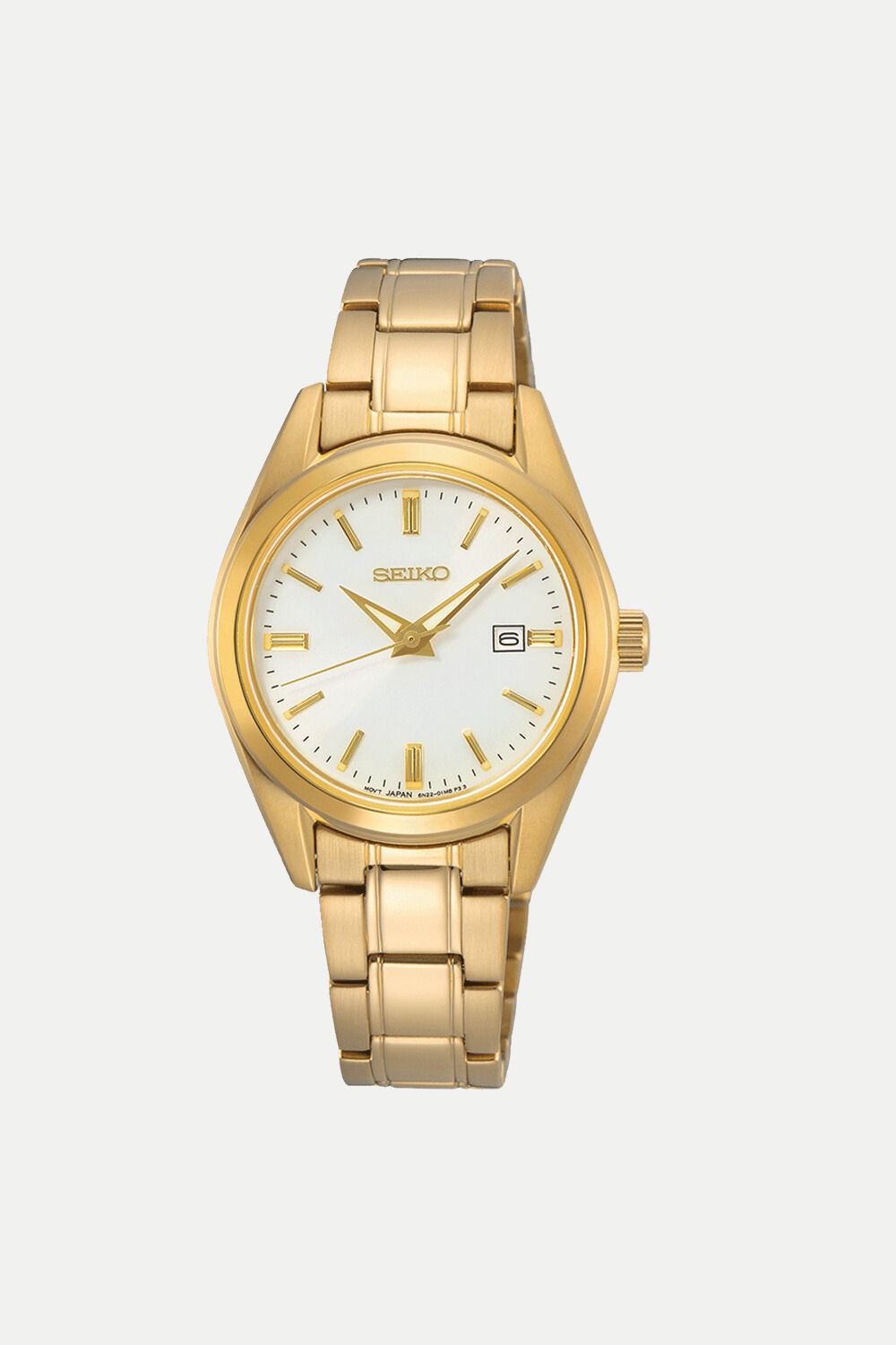 From the Essentials Collection. With classic dress/sport styling, this perfectly tailored design combines sophisticated minimalism with versatility. The silver sunray-finish dial features a date calendar and LumiBrite hands. In stainless steel with gold finish, and sapphire crystal for superior scratch resistance10 bar, 100M Water Resistant.